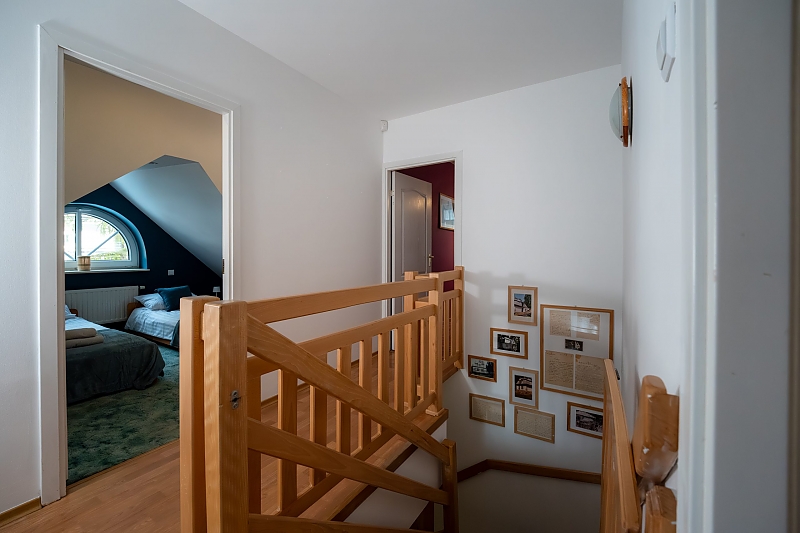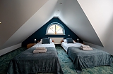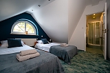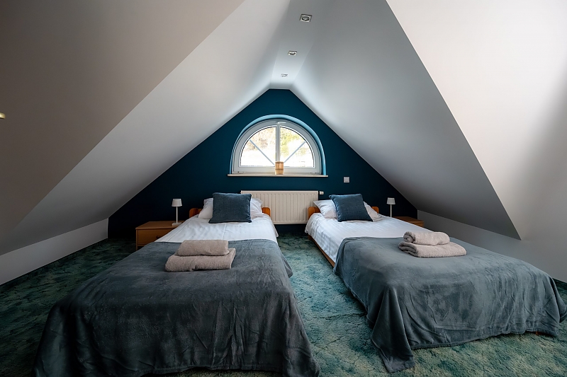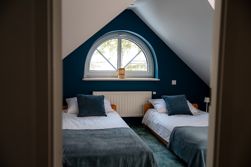 - apartament na 10 osób - większą część domu, w której znajdują się cztery przytulne sypialnie (dwie z łóżkami małżeńskimi, jedna z dwoma łóżkami pojedynczymi, jedna czteroosobowa z łóżkiem małżeńskim i piętrowym dla dzieci) każda z komfortowo wyposażoną łazienką. Na dole jest duży salon i kuchnia z pełnym wyposażeniem. W tej części dworku można korzystać z sali gier - do dyspozycji stół pingpongowy, piłkarzyki, lotki.