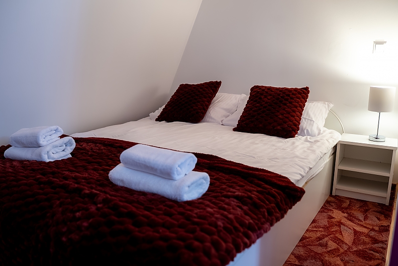 - apartament na 4 osoby - mniejszą część domu przeznaczoną dla czterech osób w której znajdują się dwa pokoje (sypialnia z dużym małżeńskim łóżkiem i pokój dzienny z rozkładanym narożnikiem), wyposażona kuchnia i duża nowoczesna łazienka.