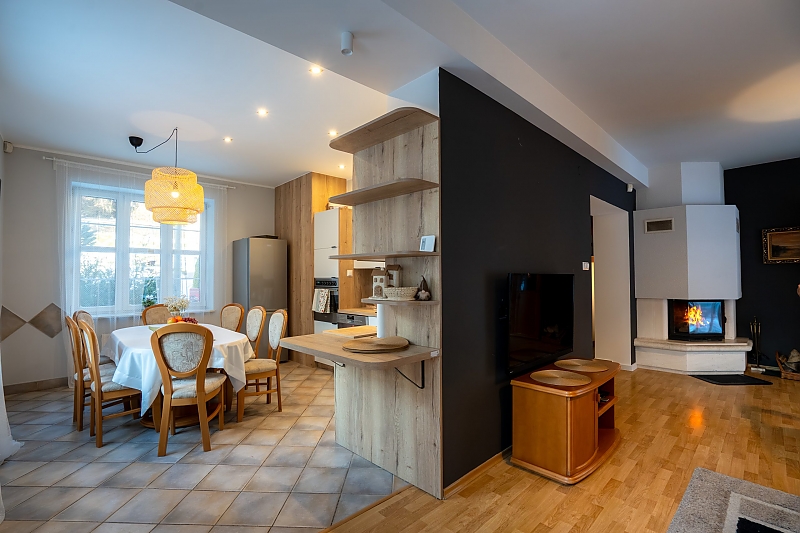 Sypialnie w dużej części posiadają własne łazenki, salon z kominkiem i wyjściem na taras oraz duża w pełni wyposażona kuchnia pozwalaja na komfort wypoczynku.