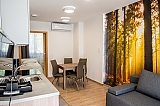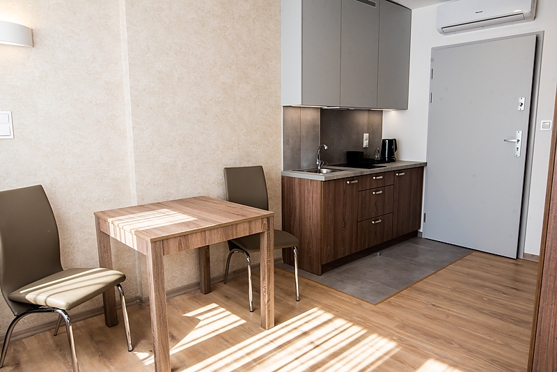 Wygodne apartamenty dla 2 osób, składają się z salonu z 43” telewizorem oraz aneksu kuchennego wyposażonego w podwójną płytę grzewczą, okap, lodówkę i komplet naczyń kuchennych.