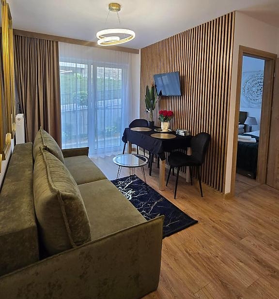 Znajdziesz tu osobną sypialnię z wygodnymi dwoma łóżkami, przestronny salon z rozkładaną sofą, SMART TV z dostępem do Netflixa oraz szybkie Wi-Fi.