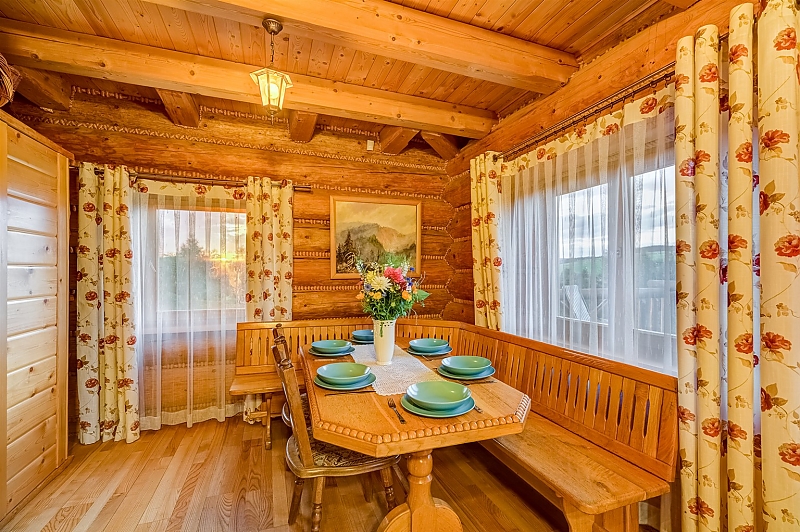 W domku może wygodnie wypoczywać aż 10 osób. Składa się z trzech kondygnacji. Na parterze mieści się sala chlebowa, sauna, toaleta i pomieszczenie gospodarcze. Na pierwszym piętrze znajduje się kuchnia z jadalnią, salon z sofami i telewizorem, część z kominkiem, taras, toaleta z prysznicem i przedpokój. Na drugim piętrze są aż trzy sypialnie i łazienka z wanną.