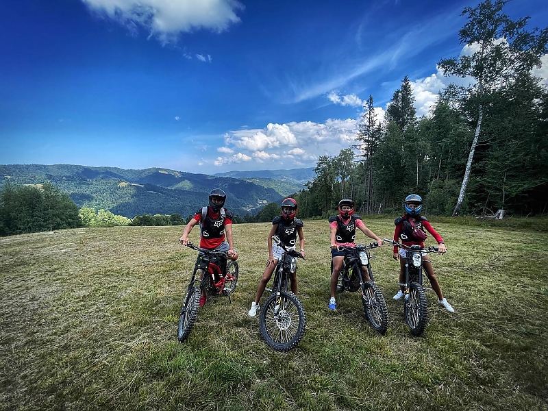 Wyprawy górskie na elektrycznych motorach marki Surron. Dzięki zasilaniu elektrycznemu motory nie emitują szkodliwych spalin oraz są ciche, co pozwala na bezpieczne ich użytkowanie w naturze.